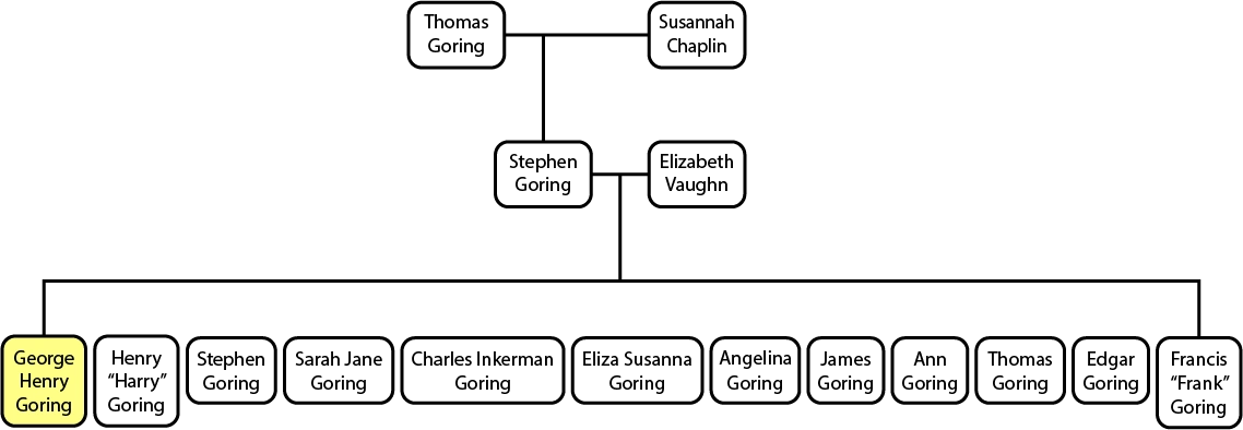 Our family’s paternal great great grandfather was Stephen Goring (B April 14, 1823 D April 4, 1904). He was born in East Grinstead, Sussex, England. His Father, was Thomas Goring and his mother was Susannah Chaplin. Stephen was a railway man – he married Elizabeth Eliza Vaughan on July 13, 1844 and in 1871 he and most of his family emigrated to Canada to work for the Grand Trunk Railway, settling on Rama Road in Langford Mills, Ramara Township, Langford Mills (near Orillia, Ontario). They had 12 known children including my great grandfather George Henry Goring (1847-1876) who died in an railway accident and left his widow Annie Siddle, with three young children.